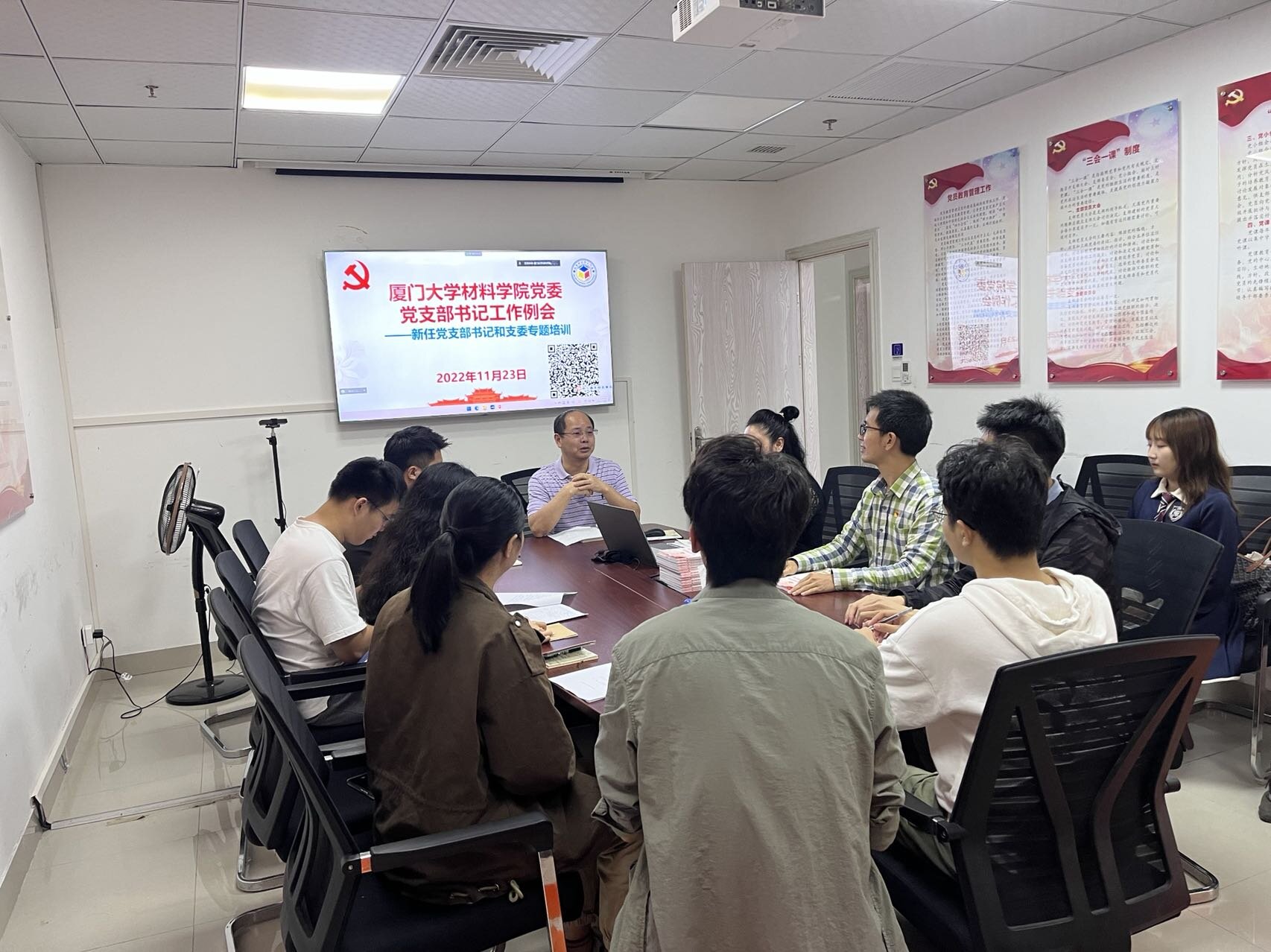 2022年11月23日,555000公海登录党委党支部书记工作例会暨新任党支部书记和支委专题培训在555000公海登录新楼101会议室举行。学院党委书记刘立荣、党务秘书苏婵和团委书记石林伟与各位新任党支部书记和支委深入学习交流,讨论支部工作,与新任学生党员干部分享工作经验。
