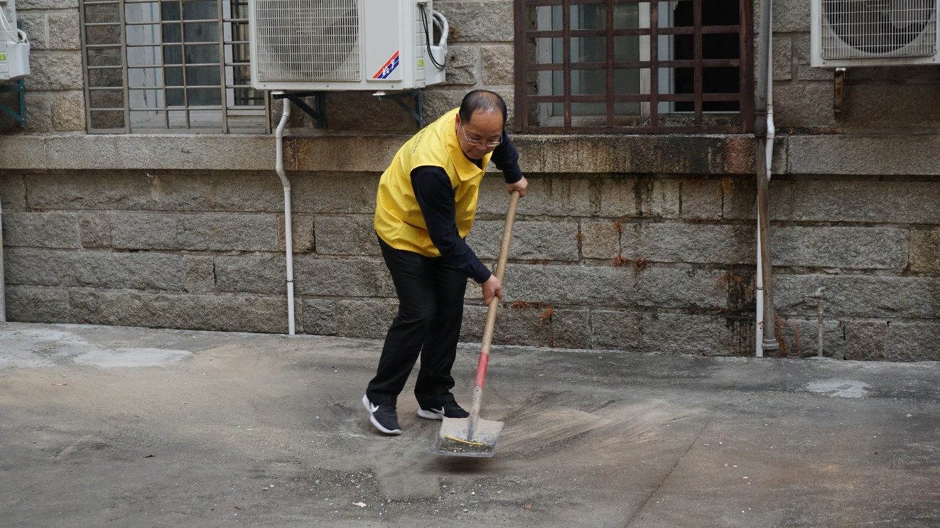 刘立荣书记对地板的水泥块、锈迹进行清理