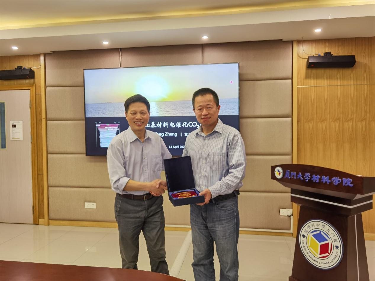 讲座过程中,郑耿锋教授围绕Cu基材料电催化CO2还原展开了一场精彩而深刻的讲座。他首先对温室气体对生态环境造成一系列严重影响以及使用基于可再生能源的电催化的研究意义和应用前景进行了简单的背景介绍;其次,介绍了其课题组近两年在水相体系中电催化二氧化碳还原领域的研究成果;最后,介绍了结合电化学反应系统设计与组装的电催化碳基小分子转化与能源储存技术的重要应用前景。