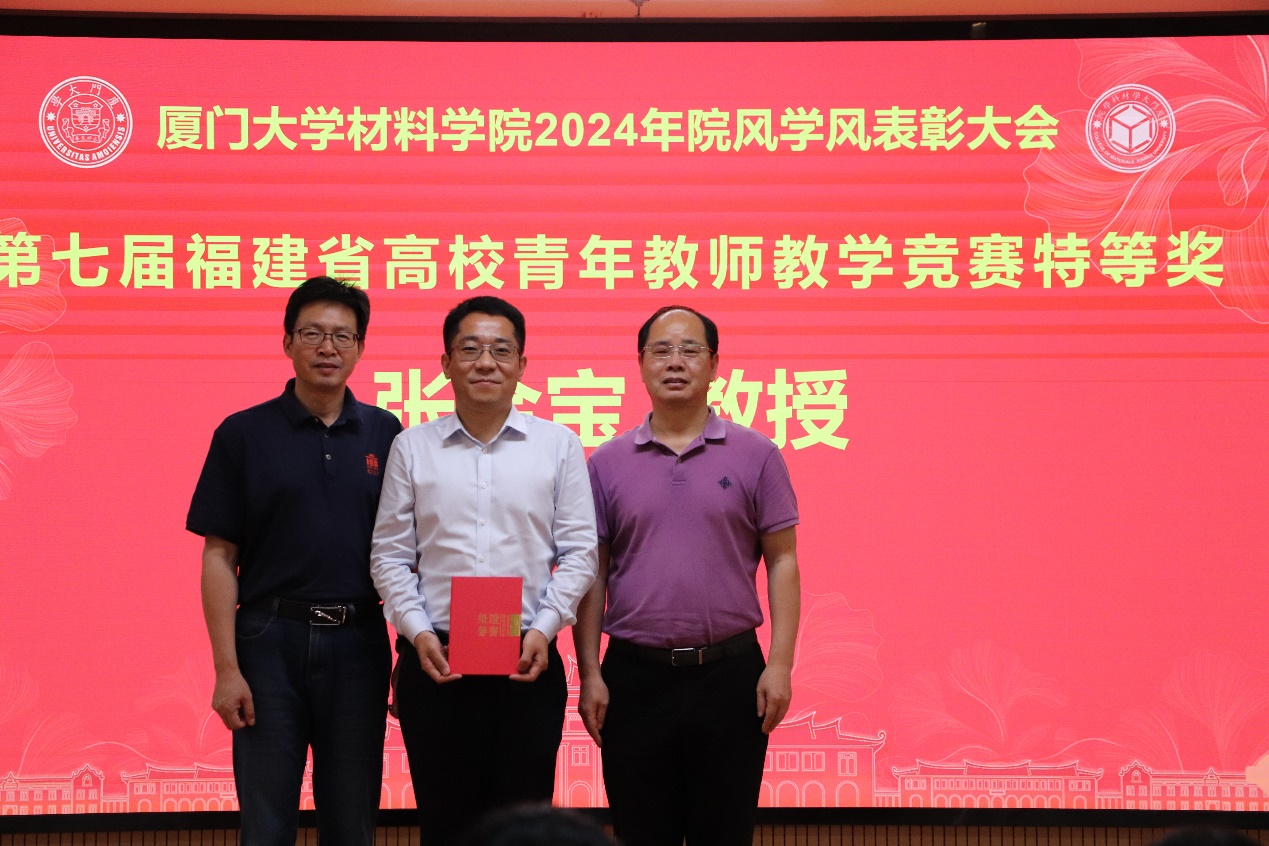 张金宝教授获第七届福建省高校青年教师教学竞赛特等奖,刘立荣和解荣军为其颁发证书。