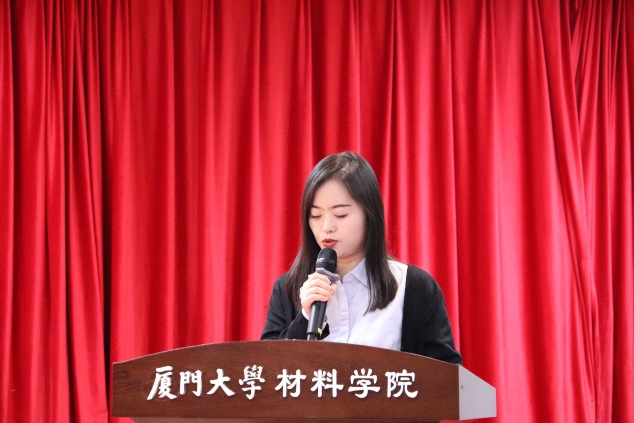 2019级博士生戴举国、2021级硕士生陈佳佳、2021级本科生郭城作为获奖代表上台发言。戴举国回顾自己的研究生生涯,鼓励每一位科研工作者要学会劳逸结合,平衡科研与休息的时间,并多参与学生工作锻炼能力,得到不一样的收获。陈佳佳分享科研学习道路的曲折与希望,以及学生党务助理职务下如何筑牢思想根基。郭城用“以匠心锻初心”为引子,讲述大一时播下科研的种子等待大三生根发芽,并用收获的能力去服务群体的故事,既要培育研发材料的“匠心”更要锻造小我融入大我的“初心”。
