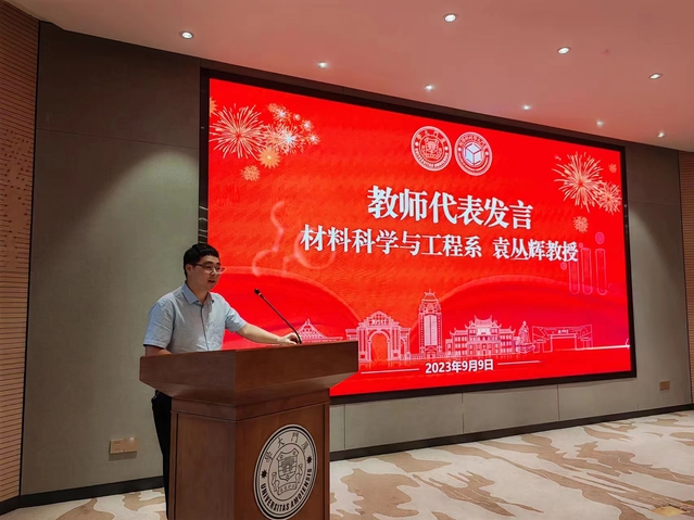 接着,教师代表材料科学与工程系袁丛辉老师从学长、导师和家长三个角度与新生们做分享:作为学长,希望大家多向师兄师姐学习,懂得“吃亏是福”,学会科研赞美,崇尚科研合作;作为导师,大家要珍惜师生每次沟通交流的机会,快速成长,同时导师也期待成为大家的朋友和科研上的战友;作为家长,叮嘱大家特别要平平安安,特别是实验安全,要学会正确评估每一件事的风险与后果。他寄语同学们在前行道路上从容应对苦难、谦逊看待成功,在555000公海登录度过一个充实、快乐、有意义的研究生生涯。