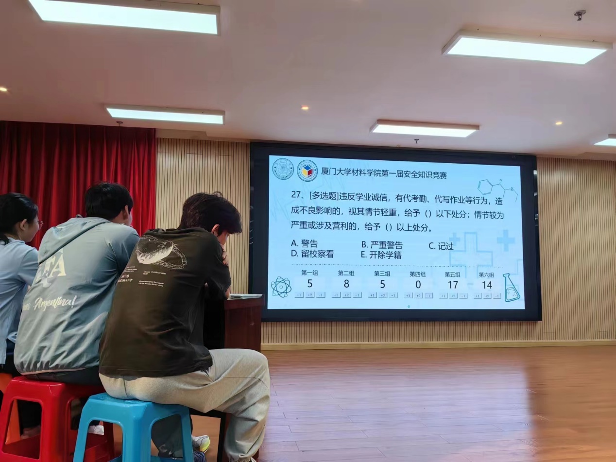 本次安全知识竞赛分为个人赛和团队赛。个人赛以易班线上答题的形式比拼。团体赛以三人为一组参赛,分为初赛和决赛两个部分。经过选拔,有六支队伍脱颖而出进入决赛。本次竞赛涵盖国家安全、校园安全、实验室安全、宿舍安全、反诈安全等多方面内容,考验选手们的安全知识储备及日常安全技能了解。