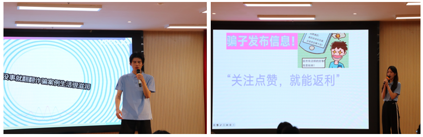 比赛环节结束后,由厦门大学反诈先锋队带来了精彩的宣讲。他们将反诈知识融进说唱等多种有趣的形式里,在给现场观众带来反诈知识科普的同时,将现场推向了另一个高潮。首先,反诈先锋队用一首自创反诈歌曲开场,在歌曲中传递反诈知识。紧接着,介绍了诈骗的类型及典型案例:冒充客服、冒充亲友、商品交易、网络刷单等。最后提醒同学们防诈骗要做到不贪小便宜,不下载陌生软件,保护好个人信息,时刻谨记“要钱不给,给钱不要”口号,守好钱袋子。