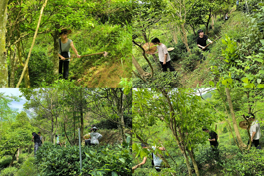 实践队员们还参与了生态茶园的除草活动,深刻体验了种植和维护这片茶园所面临的挑战。茶园采用“种树留草”的防虫模式,每隔5至6米种植了诸如降香黄檀、沉香木等名贵树木。这些树木所散发的独特香气,为茶树提供了天然的保护,有效驱避害虫;同时茶园内的杂草被有选择地保留,以吸引害虫优先取食,从而间接保护茶树。在树荫之下,实践队员们手握锄头和长柄镰刀,细心处理茶树周围的杂草,确保茶树能够获得充足的养分和光照。此次除草工作不仅是对队员们体力和耐力的考验,更是对其团队协作能力的锻炼。在劳作中,队员们展现了高度的团队精神和协作能力,相互支持,共同完成任务。通过亲身参与,实践团队成员对生态茶园的维护工作有了更加深刻的理解,对生态农业的绿色发展理念也有了更加直观的认识。