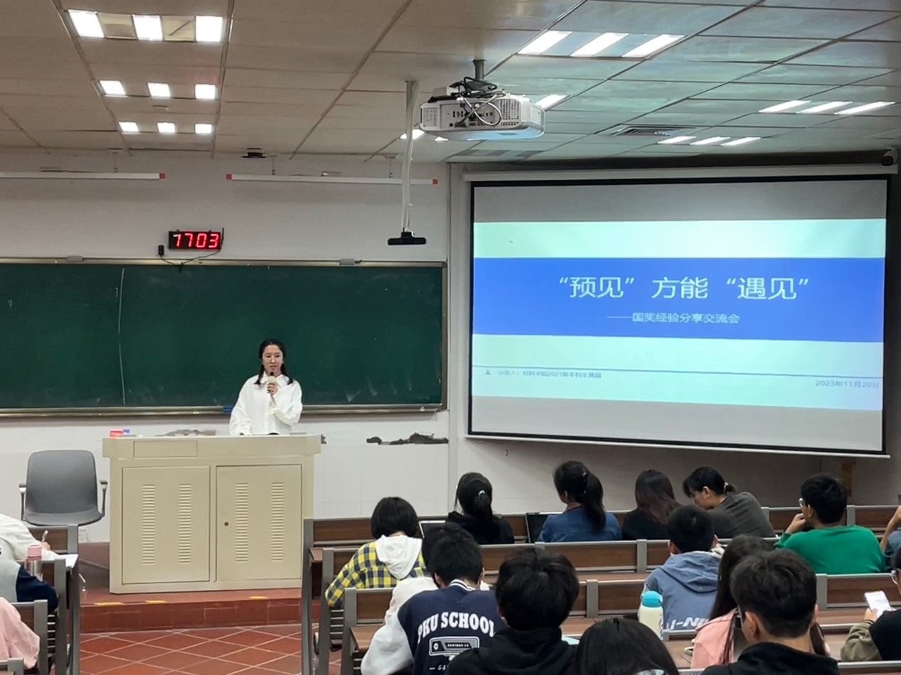 黄蕊同学从学习方法、科研竞赛、社会实践、学生工作四个方面分享了自己获得国家奖学金的心得。无论大家的目标是什么,学习永远是第一位的,鼓励大家要勤学好问,刻苦钻研。她建议大家要制定计划,明确自身目标,高效利用时间,把握住机遇,不断提升自己,机会只留给有准备的人,“预见”方能“遇见”。