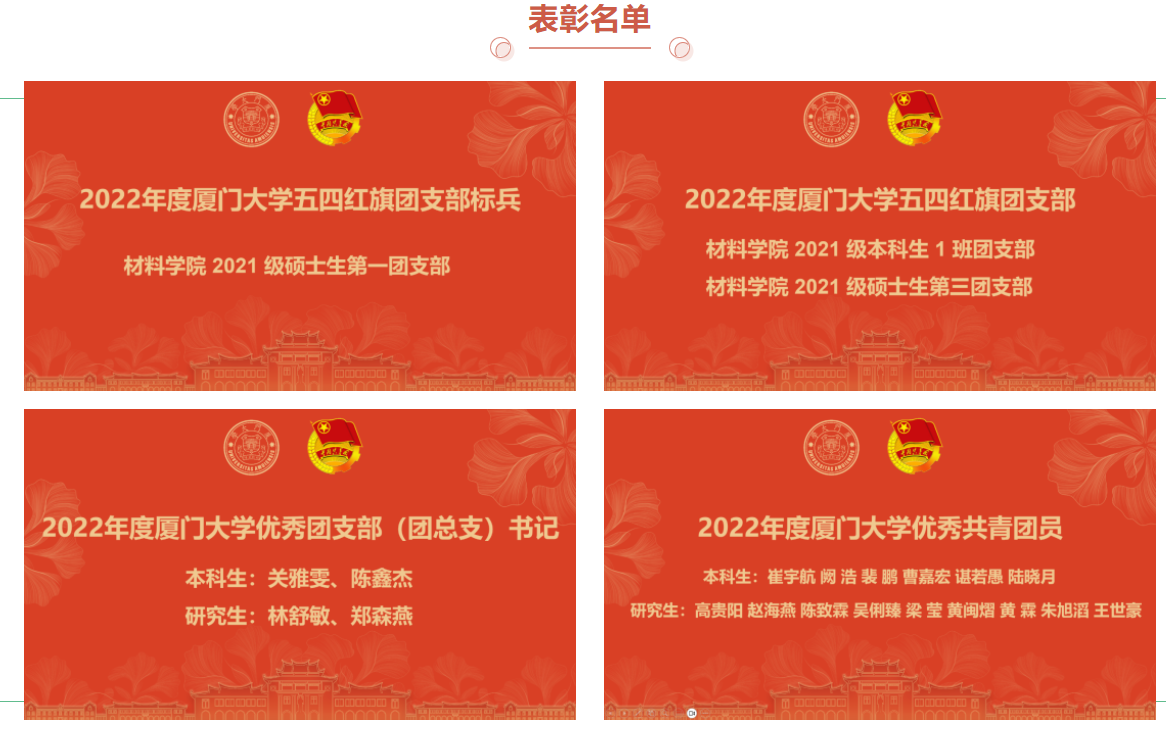 555000公海登录在本次表彰大会中获得突出成绩。2021级硕士生一班团支部荣获“2022年度厦门大学五四红旗团支部标兵”,555000公海登录 2021 级本科生1班团支部、2021级硕士生第三团支部荣获“2022 年度厦门大学五四红旗团支部”,关雅雯、林舒敏等人荣获“2022 年度厦门大学优秀团支部(团总支)书记”,还有崔宇航、高贵阳等人获取“2022 年度厦门大学优秀共青团员”称号。