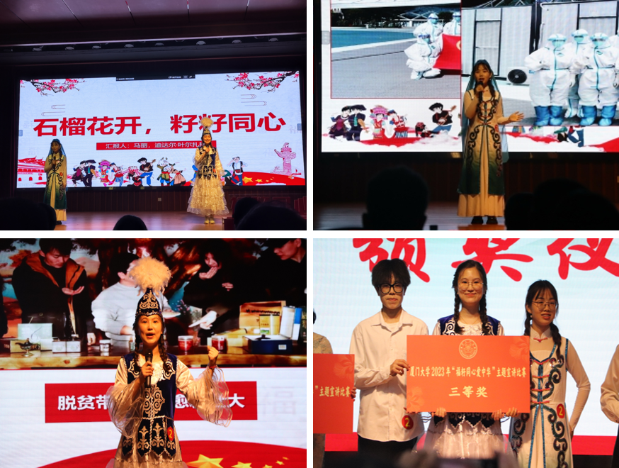 为深入开展学习贯彻习近平新时代中国特色社会主义思想主题教育和习近平总书记关于加强和改进民族工作的重要思想,引导青年学子树立各族人民休戚与共、荣辱与共、生死与共、命运与共的共同体理念,5月18日晚,由党委统战部、学生工作部主办,法学院党委承办的厦门大学2023年“福籽同心爱中华”主题宣讲比赛决赛在法学院模拟法庭举行。我院推荐的宣讲作品《石榴花开,籽籽同心》从全校38支参赛作品中脱颖而出,进入决赛并获三等奖。