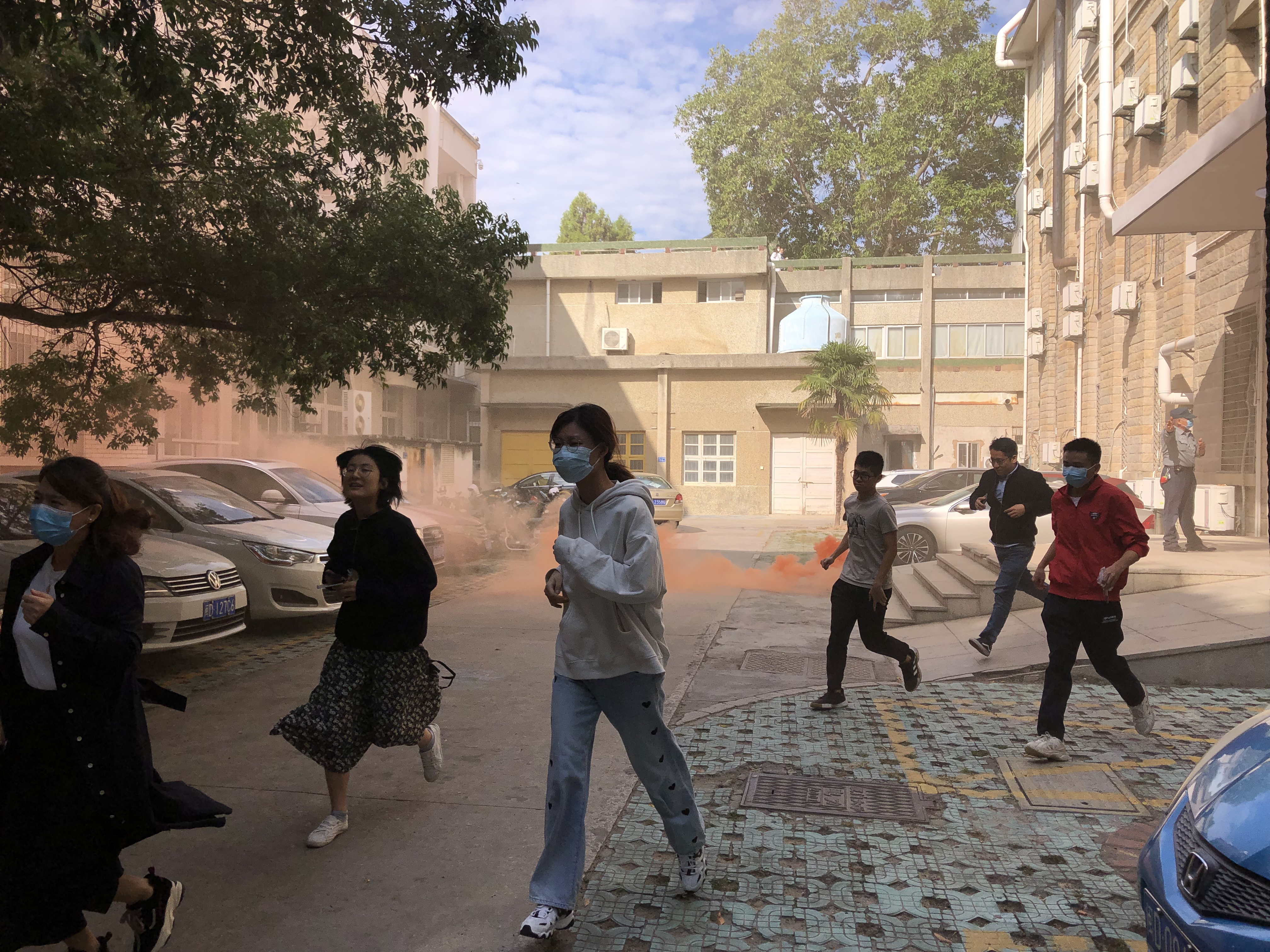 本次活动分为应急疏散演练和消防器材灭火演练实物教学两个环节。上午9时整,消控室发出警报,疏散演练正式开始,疏散引导组迅速赶到指定位置组织有序疏散,并引导正在进行实验的同学妥善中断实验进程,保持冷却水,停止加热,关好可燃、助燃及有毒气体等钢瓶。同学们严格按照疏散演练的动作要领,用湿毛巾捂住口鼻,敏捷、规范地进行疏散撤离至各楼栋前的空地。人员统计组工作人员迅速进行人数清点并开展情绪安抚工作,同时汇总上报。石巍副院长作火情应急疏散撤离演习的总结,表示大家能迅速、有序地撤离至安全区域,达到了一定的演练效果。