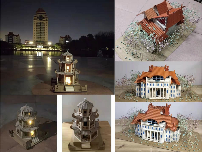 该项目要求参赛同学改造废旧材料,让废旧物品重焕新生,“变废为宝”。初赛为线上投票,经由广大同学投票选出的优胜队伍;决赛为团队现场展示,评委老师对其进行综合评判打分。在展示过程中,参赛队员从材料运用、设计理念、作品特色、环保功效等方面仔细讲解作品特色,并根据评委老师的提问进行回答,评委老师根据答辩情况进行打分并做出点评。最终,KDA队的作品“滕王阁楼”脱颖而出,荣获一等奖。该作品制作精致,结构稳固,获得评委一致好评。比赛还评出二等奖三名,三等奖五名。
