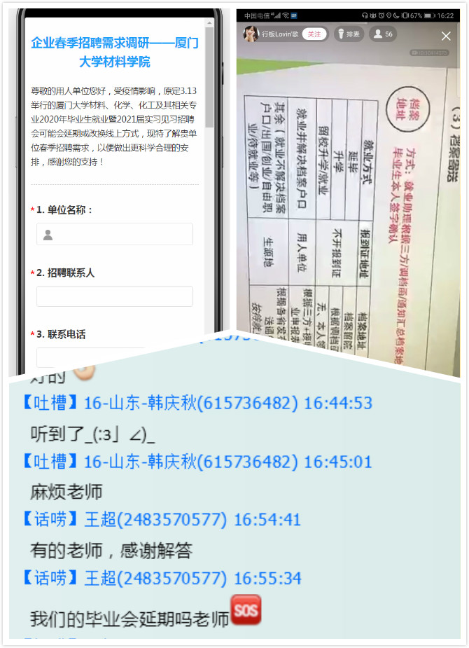 加强网上就业指导。疫情期间,很多应届毕业生虽然在家,但存在着毕业或就业等方面的困惑和担忧,针对这一情况,3月5日,学院辅导员丁渡通过QQ直播的方式,面向2020届本科毕业生,开展了一次线上主题班会,就学生们最为关心关注的问题在线答疑。针对毕业涉及的普遍性问题,丁渡依据国家、地方及学校相关规定,对报到证、户口、人事档案、党团组织关系等毕业重要事项进行讲解说明,梳理了往年毕业季的重要时间节点,提醒学生们在今年新冠疫情这一特殊情况下提高认识、早做规划。针对部分同学尤其是考研结束准备就业的群体,丁渡再次讲解说明了《厦门大学学生就业签约暂行管理办法》的相关规定,并进行相关的就业指导,鼓励同学们积极参加目前各大企业的春季线上招聘。与会同学就签订三方协议、成绩对于就业的影响、公务员考试等问题进行提问,线上互动良好。与此同时,学院通过本科生和研究生毕业班工作群,及时开展就业指导,发布就业政策和招聘信息,解答学生困惑。