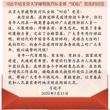 会议开始阶段,党支部书记曹莹同志向全体党员分享了习近平总书记给北京大学援鄂医疗队全体“90后”党员的回信。传达了习近平总书记对广大青年人在这次抗击疫情期间作出的努力与贡献的肯定与赞扬,这也给了目前仍然站在抗疫一线的工作人员极大鼓舞。一代人有一代人的历史际遇,如今“90后”党员也正以实际行动证明,我们同样有着家国情怀与责任担当,不管是疫情防控,还是实现中华民族伟大复兴,青年一代一定是闯关夺隘、攻城拔寨的先锋力量,也必将扛起重任。